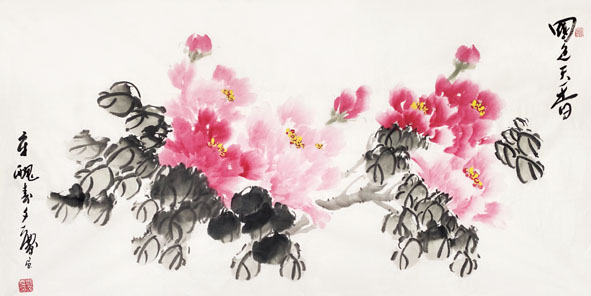劉文慶擅長寫意牡丹畫。“物在靈府,不在耳目,故得于心應于手,孤姿絕狀,觸毫而出,氣沖交漠,與神為徒。”藝術創作不是以客觀再現為能事,一定要融入自己主觀感受。多年來,他把自己的所見、所聞、所感都融入繪畫過程中,畫出了許多千姿百態、姹紫嫣紅的牡丹,同時,他也在畫牡丹過程中釋放自己情感,抒發自己的情懷,收獲人生的快樂。寫意手法畫出來的牡丹,水墨和宣紙的相互滲透和交融的意象效果好,能使人產生豐富的遐想。欣賞他的牡丹畫作品,我們可以看到,其審美特點講究的不是形似,不是生硬、呆板的描摹,也不是大紅大綠的表現,而是通過構思精巧、形似神俏、富有筆墨情趣的藝術形式追求牡丹本真和自然的表現,追求牡丹“神韻”的表現。他筆下的牡丹花,呈現給人的是或陽光燦爛生機盎然,或飄逸幽靜,或嬌艷欲滴,總是形似神俏,靈動含情,意蘊飛揚,讓人能夠感受到濃濃的春意,聞到陣陣的花香,把牡丹的那種雍容華貴,花中之王的氣質表現得淋漓盡致,讓人體味到一種積極向上,朝氣勃發的生命活力,具有很強的藝術感染力。