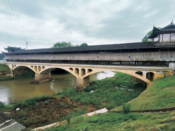 元至正十六年(公元1356年),鄉里人又重建此橋,因地處登仙里,故又名登仙橋。重建后的登云橋,有整形方石砌就的橋墩4個,橋墩上游處呈鷹嘴狀,以減少水的沖擊力。墩上用優質粗原杉木層疊為梁。梁上鋪木板,再用細沙、方磚砌成橋面,平坦而穩固。橋寬5米,全長60多米。橋上架設廊屋,青瓦蓋頂。橋兩邊圍半截欄桿,下置條凳。橋中央設神龕一個,供奉真武神像。其腳踏龜蛇,以示鎮河妖水患乞風調雨順之意。橋北端設一大神櫥,櫥內塑關公像,左立周倉,右立關平。神櫥兩旁有副對聯,聯寫“志在春秋功在漢,心同日月義同天”,橫批“肝膽相照”,以歌頌關公的俠肝義膽。1980年,古橋因破舊被拆除,繼而代之的是座石拱橋。2002年,村民又集資,在石拱橋上建起廊屋。