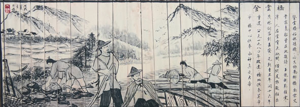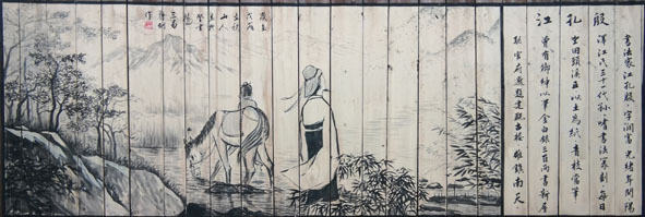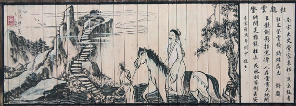 登云橋大概算是最精致最有文化內涵的廊橋。橋頭分別都有一個高高的樓臺即可以在此品茗觀景,又可以在此賦詩作畫。橋邊的掛板有幾十副水墨畫,題有解說文字,把建甌小橋一帶的名人雅士、名勝古跡、風土人情說個遍。