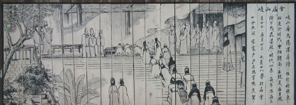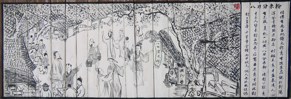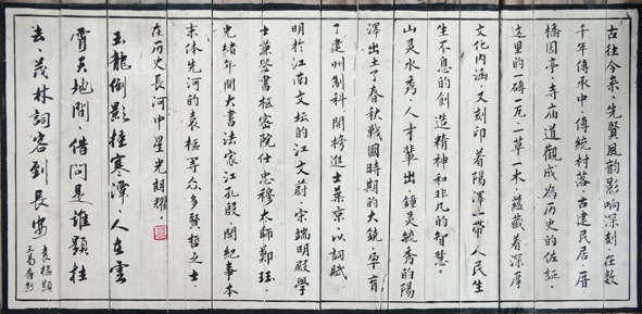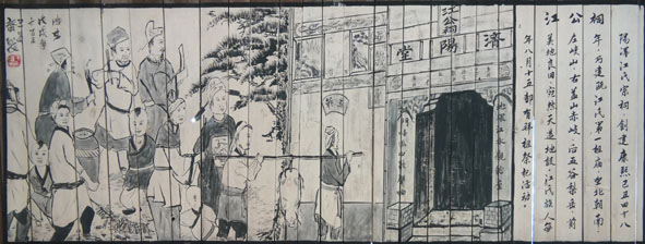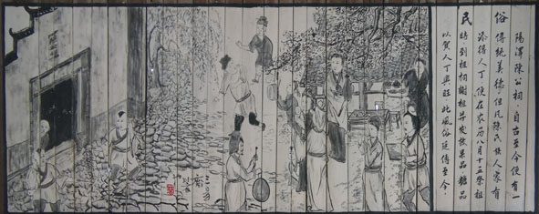 這些圖文并茂的畫,反映名人軼事的有:袁樞著書、村民捕虎、葉京、江文蔚、江禮殷等;反映名勝古跡的有:陽澤烈士陵園、江公祠、明清古民居;反映特產和民俗的有:八刀分米粉、岐山廟會等,可以說小橋鎮的文化旅游景觀節點與亮點都集中在這里,也可以說是小橋鎮的十里文化旅游景觀走廊的濃縮版或精華版。