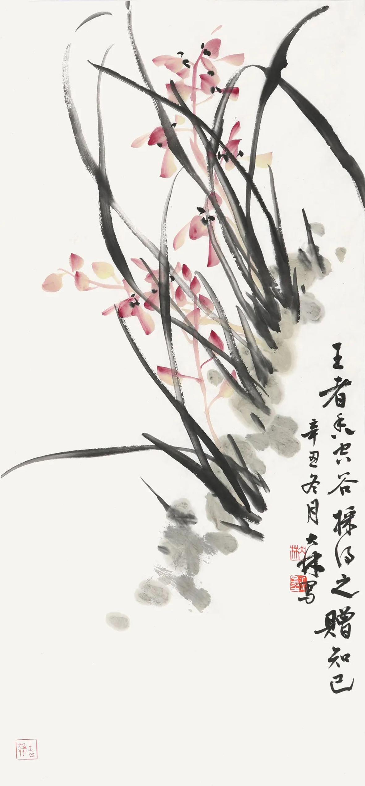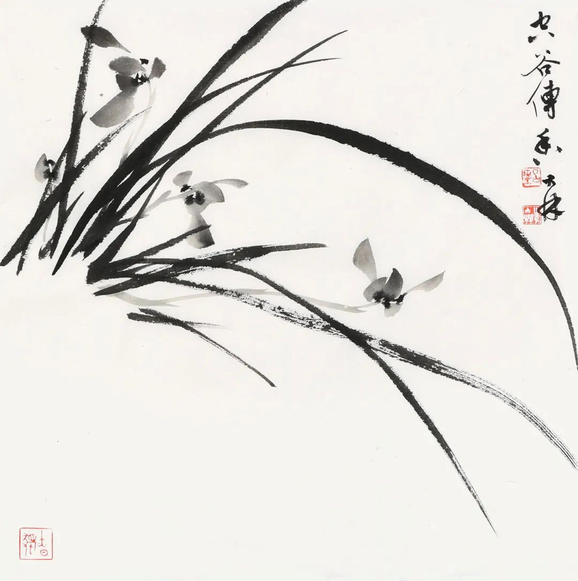 大林既是畫蘭高手,又是書法家。2019年,曾在朱紫坊舉辦過個展,今次又與為峰先生聯(lián)袂辦展。觀其寫蘭作品,在繼續(xù)追求墨韻的變化的基礎上,更注重用色彩來表現(xiàn)蘭花,雖有色彩但依然保持著素蘭的韻味。我注意到,大林寫蘭出筆更加果敢,蘭葉更加挺秀,蘭花更加多姿。大林的書法,隨意