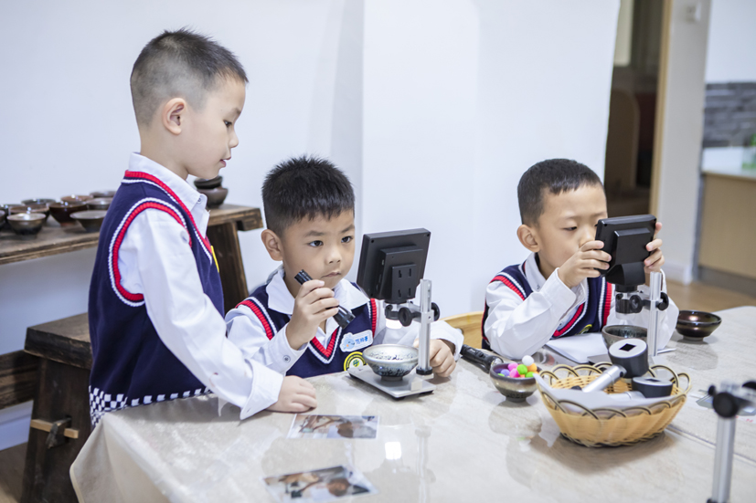幼兒園在戶內外空間的建設、生活環境的創設、游戲材料的豐富等都以幼兒需要和興趣為導向,以幼兒發展為根本。在這個“樂園”里,師幼一起探索著身心快樂的要義,幼兒學會快樂生活、樂享游戲、樂于學習,獲得寶貴的成長經歷。而教師們愿意做“樂園”里的耕耘者,用心陪伴和用愛守護的支持者。順應兒童興趣需求,創設了探究的游戲環境,幼兒可以從室內玩到戶外,從地面玩到平頂;戶外有各類果樹、茶樹、花卉、蔬菜;有山坡隧道、戰壕堡壘、沙水管道、小橋坡道,這樣巧奪天工的天然設計,讓幼兒感覺到自然天成和身臨其境的情境教育;順應發展需求,創設可學習的游戲環境,有娃娃家、種植區、探究區、藝術區等,孩子們在草地里搭帳篷,石頭當鍋樹葉抵菜、拿著顯微鏡觀察茶葉的葉脈,在水池里用不同工具打撈泥鰍,在涂鴉墻上盡情潑墨,孩子們在原汁原味、不事雕飾的游戲中,盡顯野趣;順應個性化需求,創設可嘗試的游戲環境,建盞館里有孩子、家長和老師三方協力制作的非遺“建盞”,木工坊里,有孩子們稚嫩的小手制作了各具特色的木工作品,在操作中啟發心智、收獲有益經驗。
