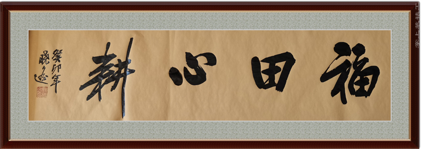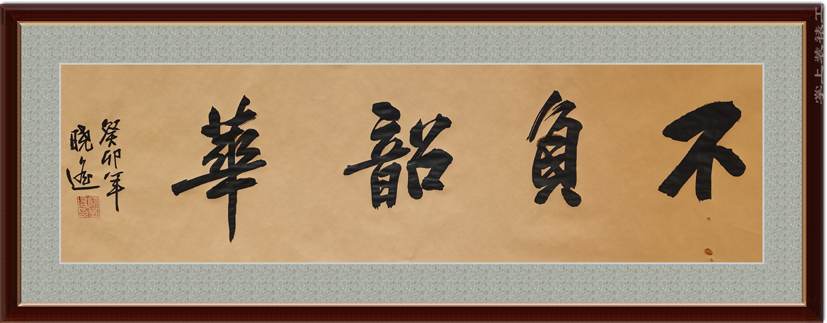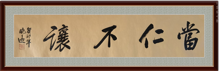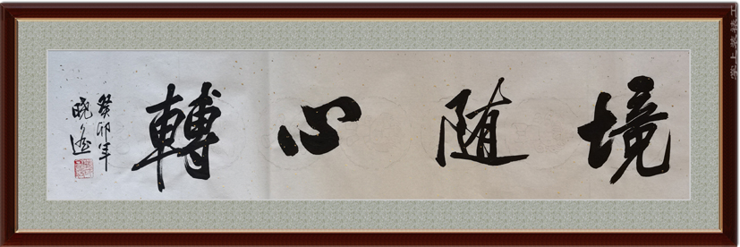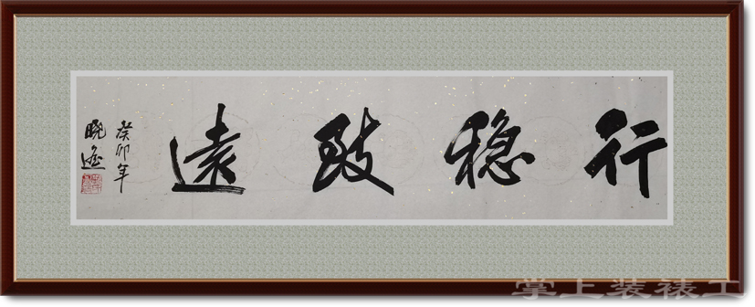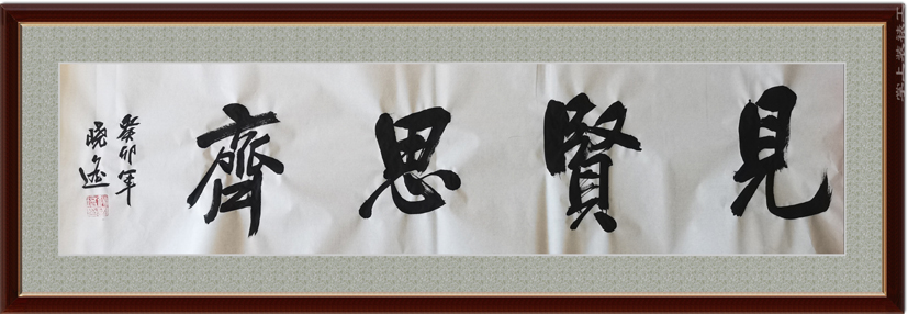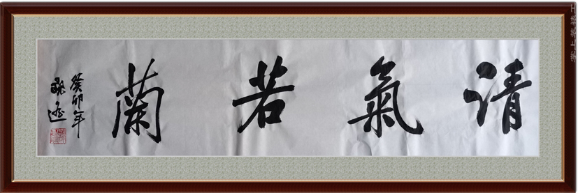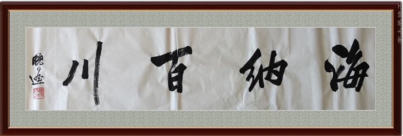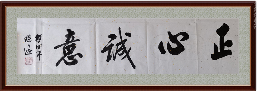 姚國培的書法,從用筆上來看,尤其是他的大字用筆渾厚,用墨非常飽滿。方中帶圓,有一定的魏碑意趣。從結(jié)體上來看,姚先生應(yīng)當是臨習過圣教序和李思訓(xùn)碑的。圣教序是懷仁集王羲之的字,這個碑是行書里面非常有名的碑,是學習行書的人首先的一個帖子。圣教序的字,結(jié)體以欹斜多變著稱,用筆瘦硬勁拔,是王羲之書中集陽剛美與流暢宛轉(zhuǎn)之勢為一體的代表書風。李思訓(xùn)碑,同樣也是以用筆瘦硬勁健,結(jié)體欹斜開張著稱。相比較而言,李思訓(xùn)碑的結(jié)體欹斜對比更強烈一些,比圣教序的結(jié)體更大開大合一些。這種結(jié)體,整體上給人的感覺是左低右高,重心不穩(wěn),營造出一種突兀拔地而起的氣勢。除外,魏碑中的張猛龍碑也是這種結(jié)體的典型代表。宋代的黃庭堅進一步發(fā)展了這種欹斜相生,大開大合獨特的書風,形成了長槍大戟,開合對比非常強烈的一種字體。從姚國培的字中可以看到其中上述諸人的影子,這說明他對傳統(tǒng)的碑帖是下過不少功夫的,吸收了多家特點。相比較他的小字,應(yīng)當說他的大字更好,更加有氣勢,也更為雄渾一些。姚國培的書作,主要是以對聯(lián)以及格言警句,四字和六字、七字的對聯(lián)行形式多。應(yīng)當說,姚國培的字如果創(chuàng)作一些長篇形式的作品,也會很不錯的,形式將更豐富多變一些,也更利于字體的多方面布局與表達。