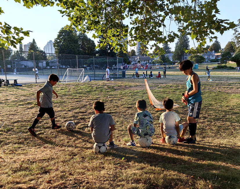 我沿著公園邊緣的步道散步,走了一圈下來,發(fā)現(xiàn)公園既沒有大門,也沒有圍欄和明顯的標(biāo)志性建筑物,只是僅僅在道路旁邊的草坪上立著一塊不起眼的牌子,上面寫著Ernie Winch Park,即溫奇公園。我想,還有什么標(biāo)志比得上這三四十畝的綠色生態(tài)公園更引人注目呢?不遠(yuǎn)處,只見兩撥孩子分別圍著兩名教練抑或家長在踢足球,眼前這二三十多名孩子的年齡大至為七八歲,烈日下個個汗流浹背、生龍活虎地穿梭馳騁在球場上。緊挨著的兩個網(wǎng)球場又是另一番景象,一名八九歲的女孩與她的父親在打網(wǎng)球,女孩揮舞著球拍,動作嫻熟,扣球有力,儼然一位小專業(yè)運動員。一旁還有一對年輕夫妻陪著一個大約只有二歲左右的男孩玩足球,更有甚者的是,只見一個一歲多的男孩穿著尿布濕在音樂噴水廣場上被淋的濕漉漉的來回穿梭。此外,還有打排球、打乒乓球的,一些年齡更小的幼兒在家長的照看下玩滑滑梯、蕩秋千等。也有溜狗的、閑聊的、躺在草坪上聽音樂的。我的外孫和外孫女則與他的另一個同學(xué)騎著自行車在草坪上你追我趕,玩得不亦樂乎。在休息區(qū),一群大人和小孩圍著一個臨時攤點購物,我移步駐足觀看,原來是幾位母親分別帶著她們的孩子在賣Chips、Pocky等零食,一位母親告訴我:“從小培養(yǎng)孩子自食其力的能力及商業(yè)意識很重要,孩子有了健康的身體和商業(yè)頭腦,長大后就會有較好的發(fā)展前景。”讓我大跌眼鏡的是,這4名孩子中,年齡最小的居然只有6歲,最大的也才8歲,而這種商業(yè)體驗兩年前就開始了。
