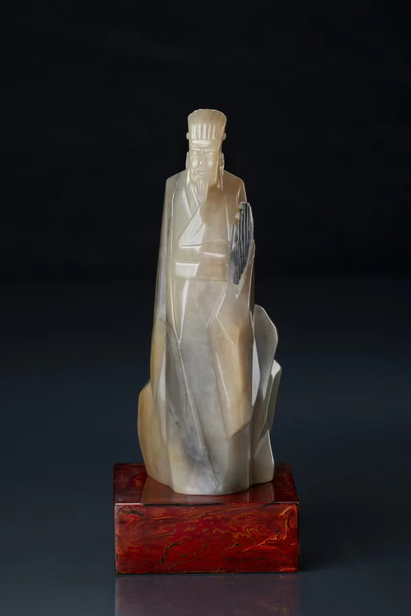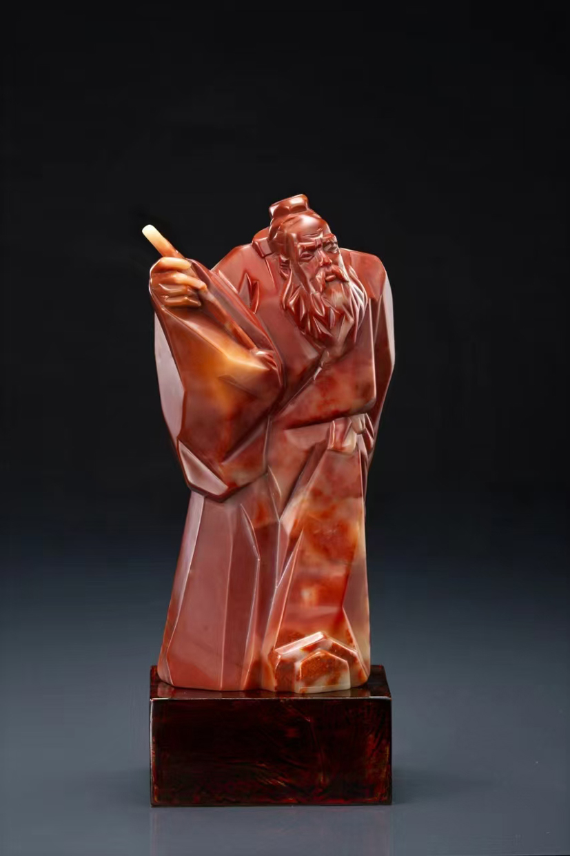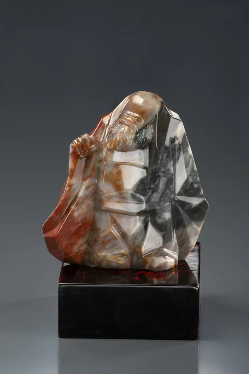 在福建壽山石雕刻界,黃寶慶是一位里程碑式的人物。他從事壽山石雕刻藝術工作四十多年,屢獲大獎。在創作中他主張象外求象、大象無形,把雕塑幾何切面應用到壽山石人物雕刻中,創作了大量精品佳作。這種創作理念和創新手法,是黃寶慶對傳統壽山石雕刻藝術的當代轉型,是對傳統壽山石雕刻方式的一種嘗試、探索和突破。宋偉光教授稱贊他的作品“具有當代構造感的雕塑語言。” 如2023年在中國美術館展出并被該館收藏的《深中隱厚》(6.3cm×6.3cm×13.5cm),其方寸之間所展現出的磅礴氣象讓我震撼,深感黃寶慶是一位“知行合一”的踐行者。他將一方普通的印石中的色彩、線條等元素,以幾何切面的方式較好地呈現出《史記》中記載的壺遂這位廉政忠厚的歷史人物的神采和靈魂。作品展出后得到專家和社會各界的一致好評。