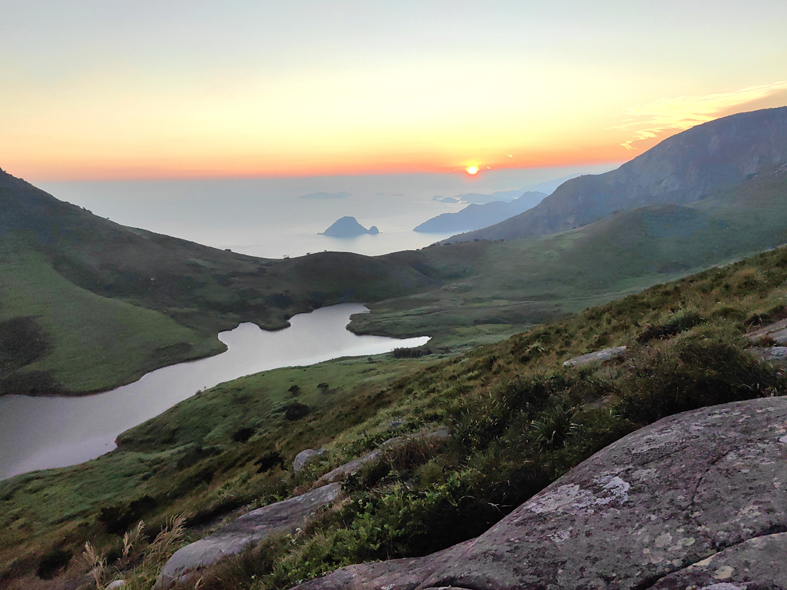 稍作休整,我們行至半山腰,一片澄澈的淡水湖映入眼簾。這是全省海拔最高的天然湖泊,湖水倒映著天光云影,靜謐如畫。抵達(dá)山頂,萬(wàn)畝草甸如一塊無(wú)垠的綠色絨毯,在山間鋪展蔓延,羊群點(diǎn)綴其間,悠閑地低頭覓食,勾勒出一幅“天蒼蒼,野茫茫”的田園畫卷。我憑欄遠(yuǎn)眺,夕陽(yáng)正緩緩沉入東海,將漫天云霞染成絢爛的橙紅,粼粼波光倒映在海面上,宛如碎金撒落,美得令人屏息。